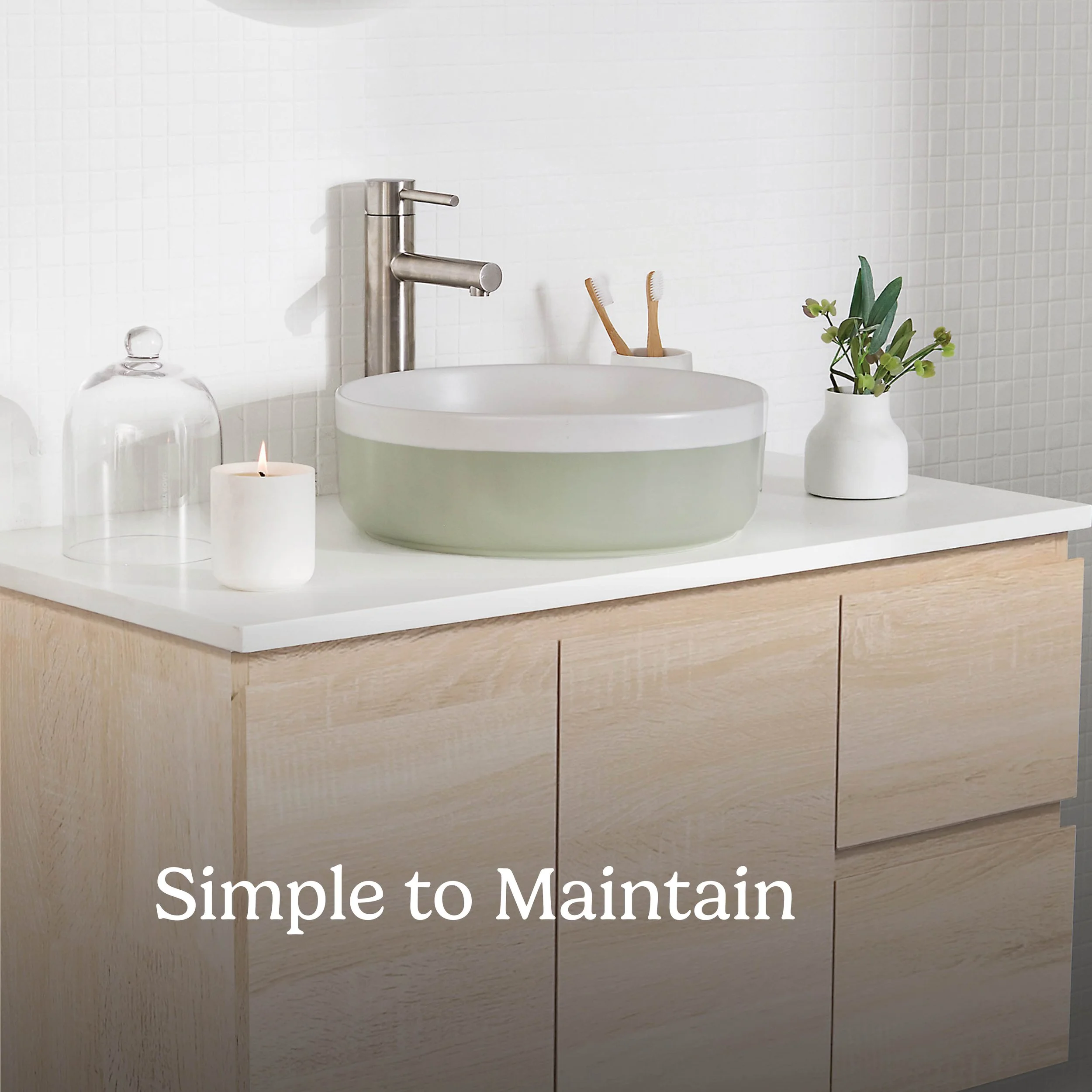 Countertop basins can be notorious for spillage around the basin, which has the risk of deteriorating the benchtop material prematurely if not wiped straight away. Cibo Bathroomware benchtops are a solid surface which makes them hardy for everyday use.