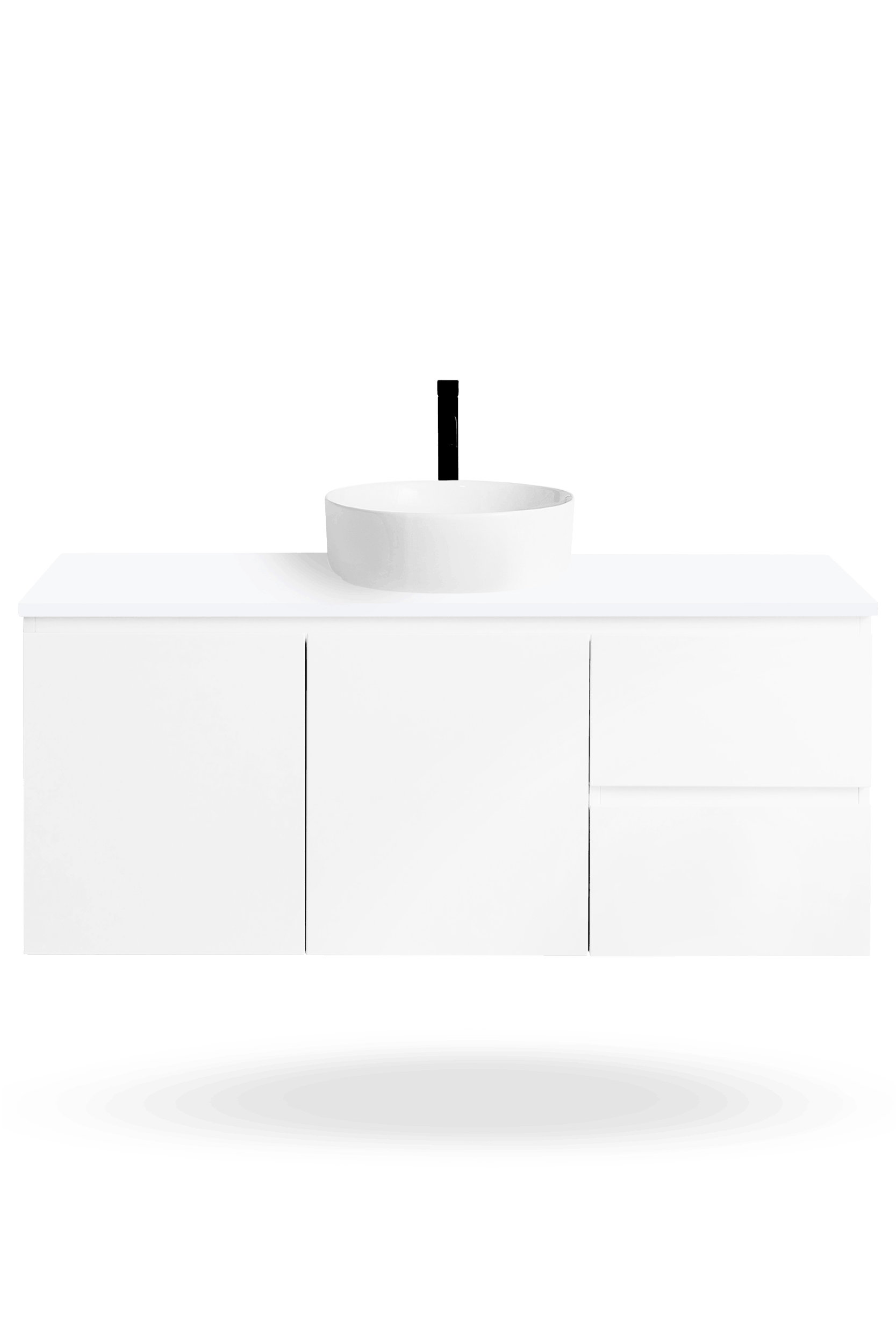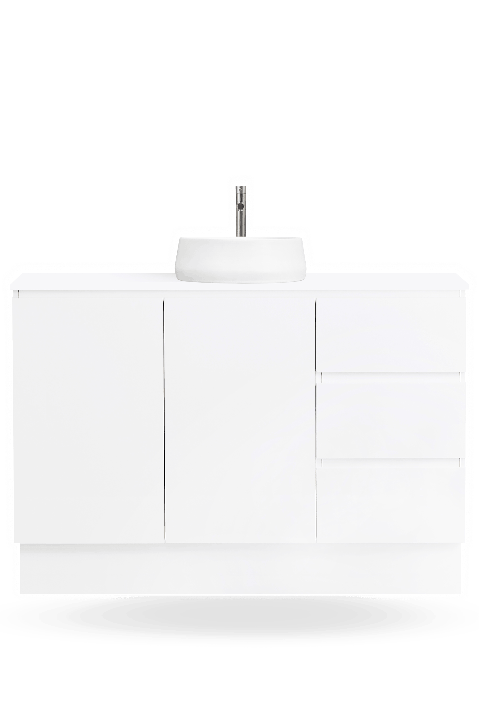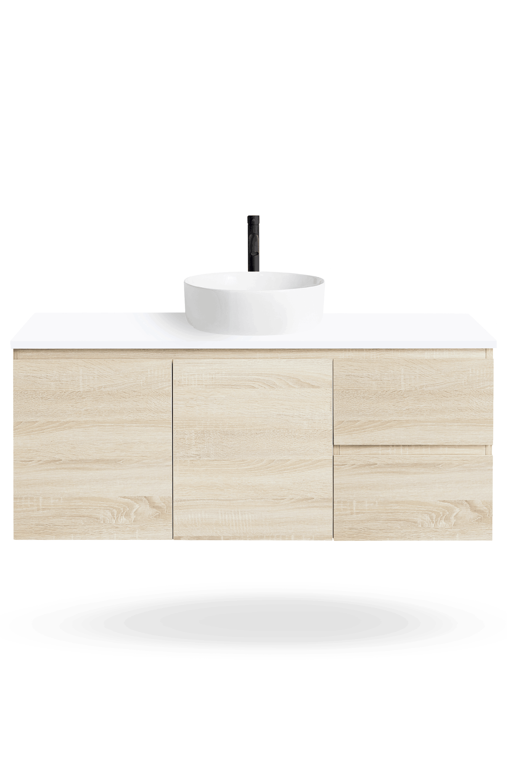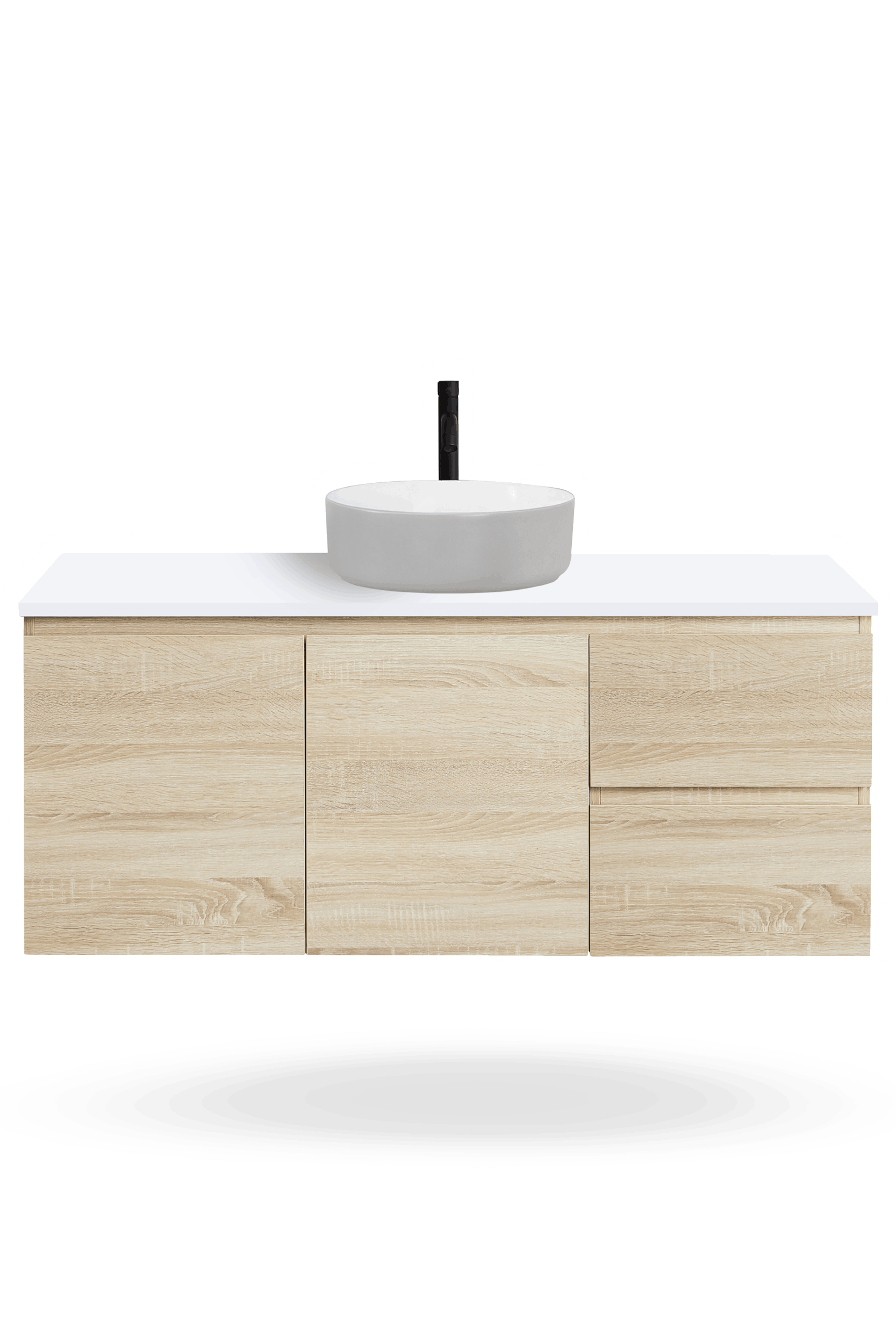 The Nordic 1200mm vanity range includes freestanding and wall hung bathroom vanities with soft-close doors and drawers, a Chalk White 100% crystalline silica free CIBO Solid Surface top, and a choice of ceramic basins to suit your preferred basin colour and bathroom layout.