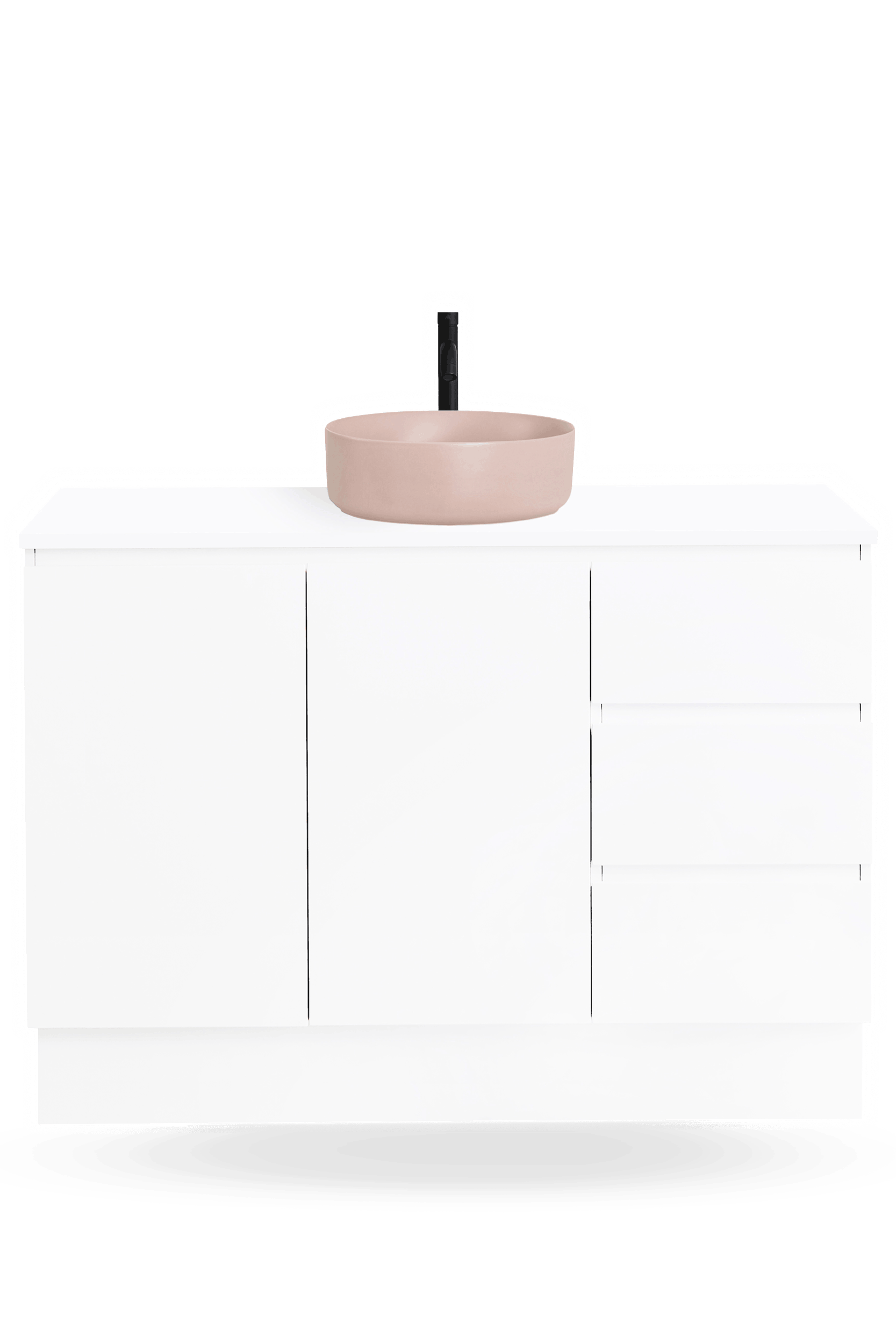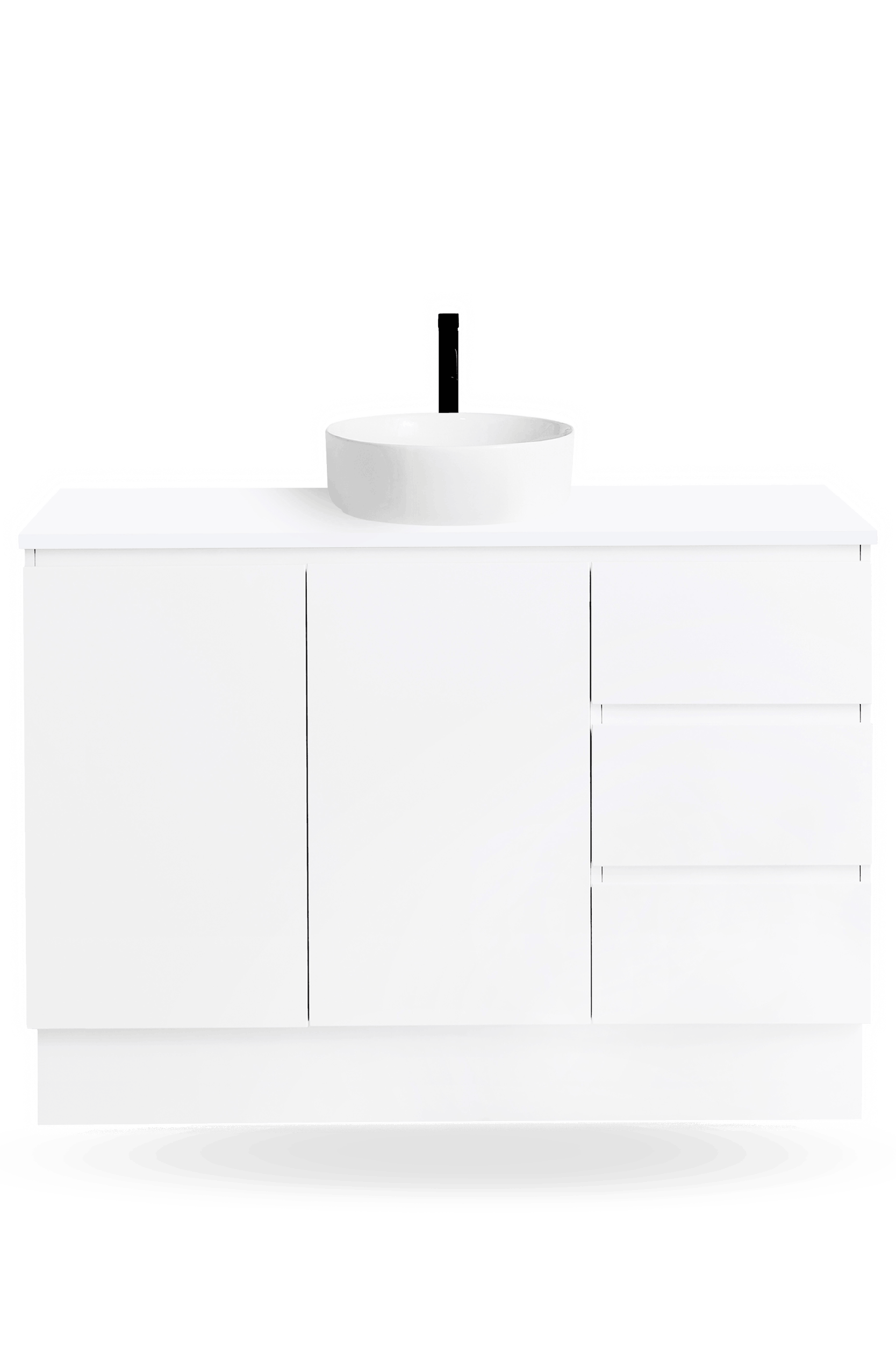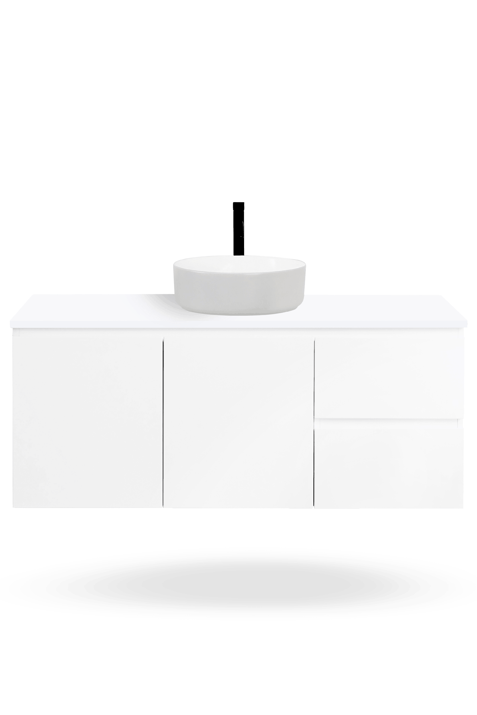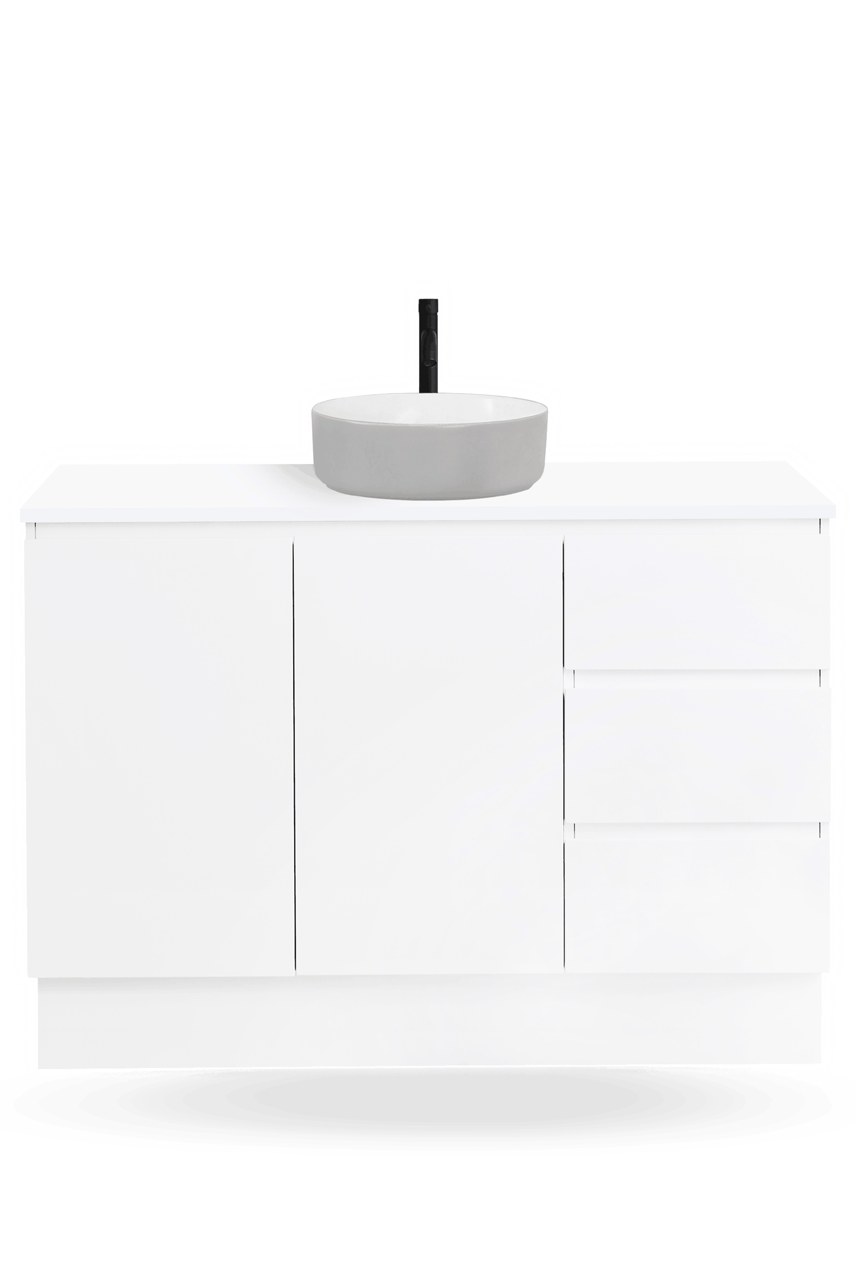 The Nordic 1200mm vanity range includes freestanding and wall hung bathroom vanities with soft-close doors and drawers, a Chalk White 100% crystalline silica free CIBO Solid Surface top, and a choice of ceramic basins to suit your preferred basin colour and bathroom layout.