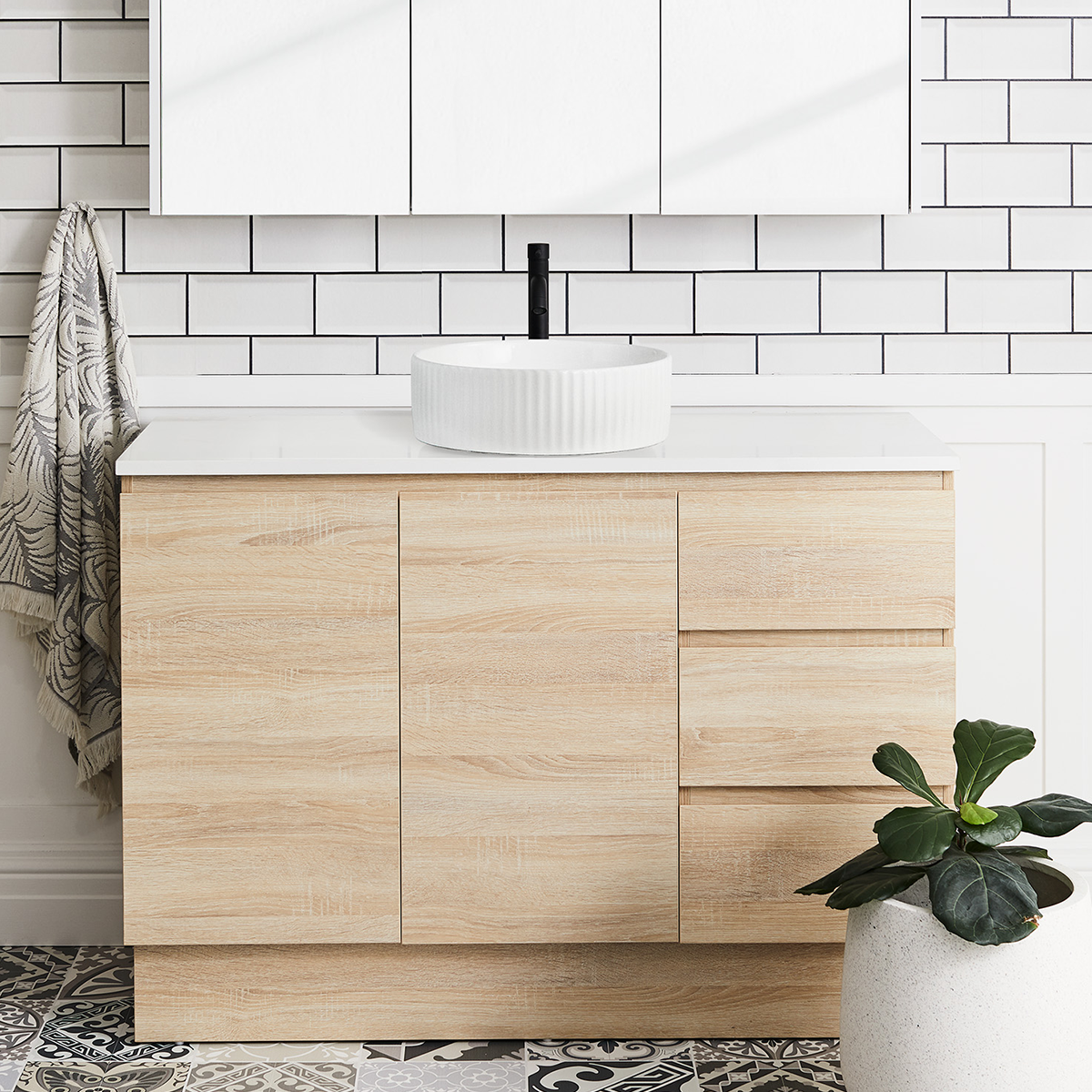 Nordic 1200mm vanities are available in finishes including white and Coast veneer for a timber-look style.