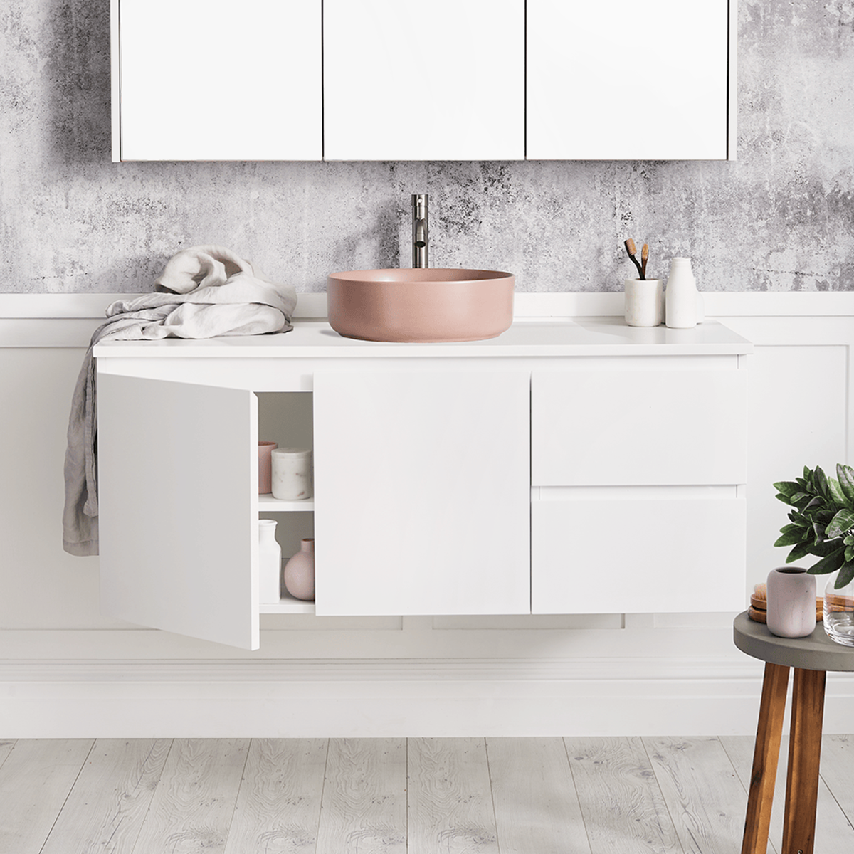 Choose from crisp white bathroom vanities or Coast veneer for a natural timber look bathroom vanity. You can also explore other Nordic widths including 600mm, 750mm, 900mm, 1200mm and 1500mm to find the right fit for your bathroom.